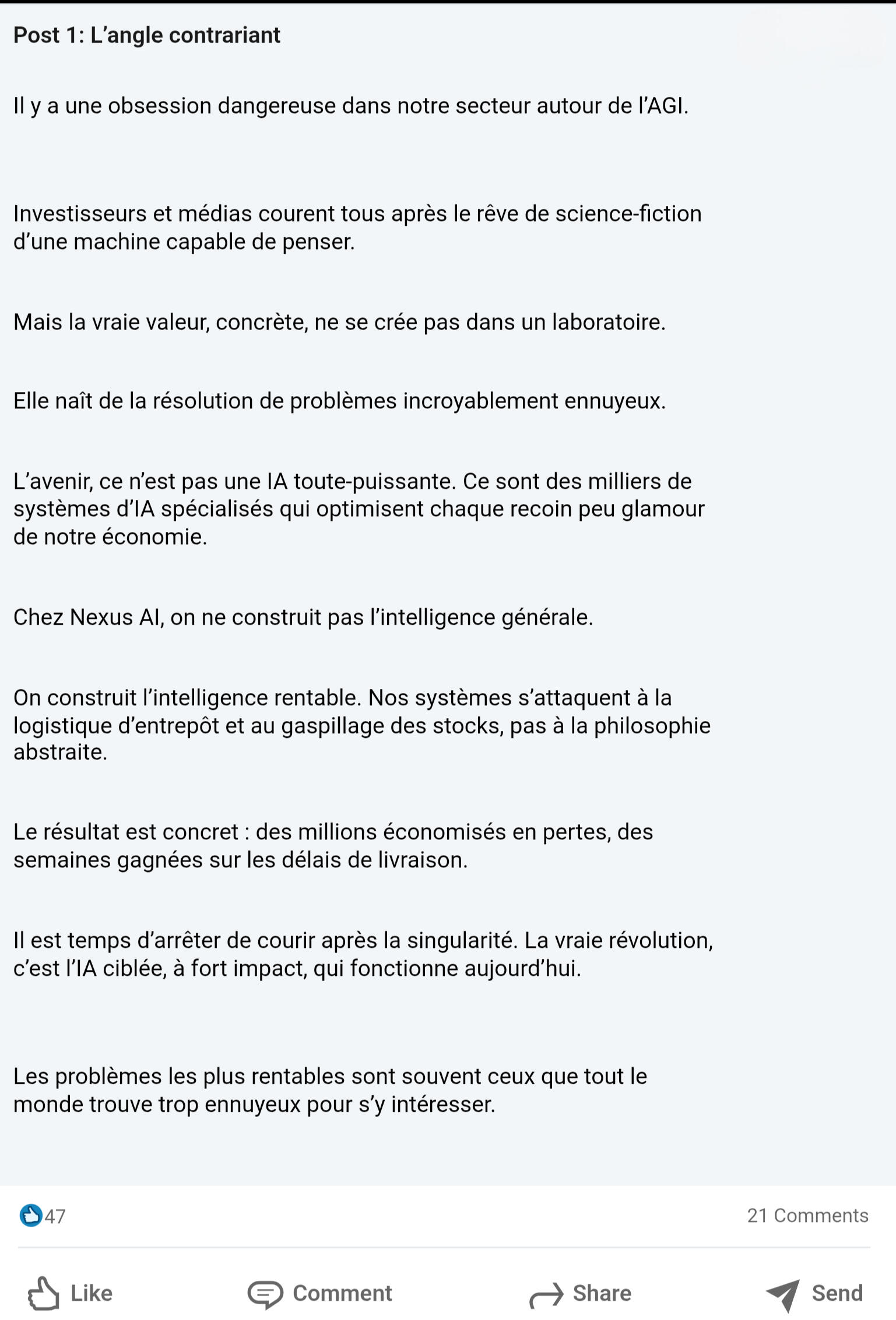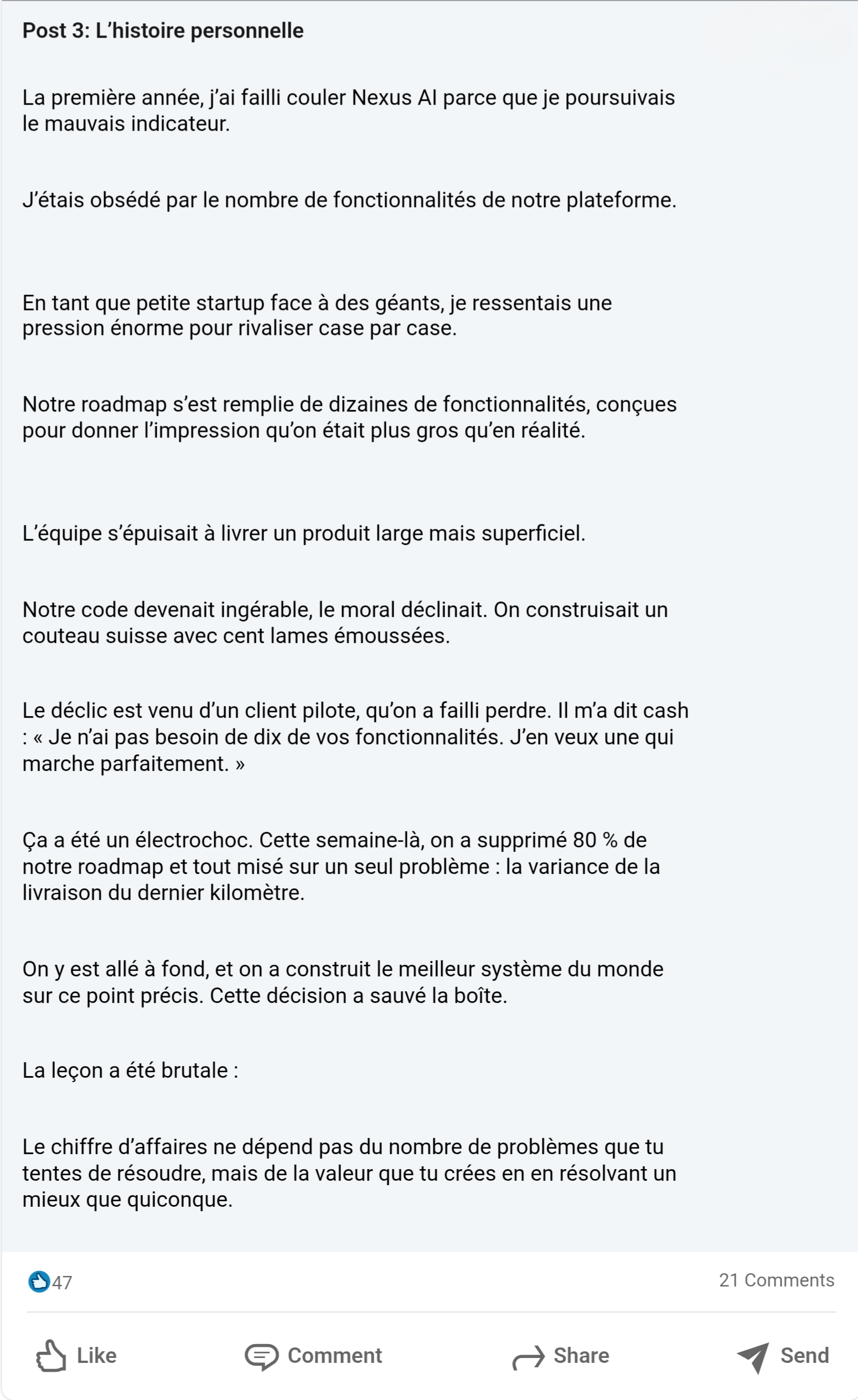 Impact: Démontre la rigueur intellectuelle et crée du contenu à forte valeur ajoutée.---Post 3: Histoire Personnelle