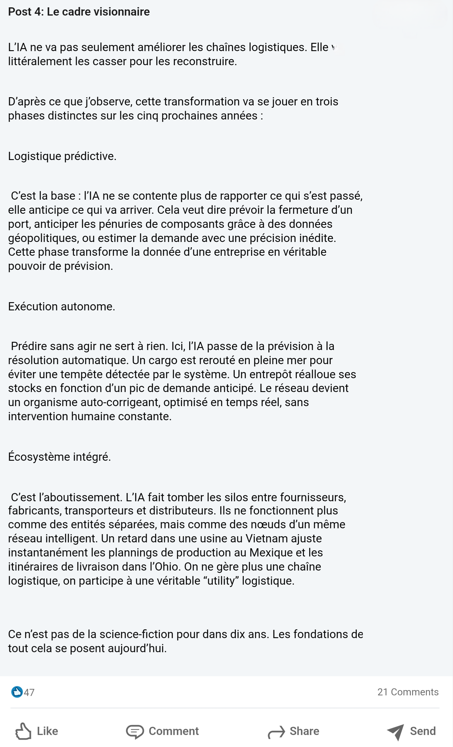 Contenu: « L’IA ne va pas seulement améliorer les chaînes logistiques. Elle va littéralement les casser pour les reconstruire… »
