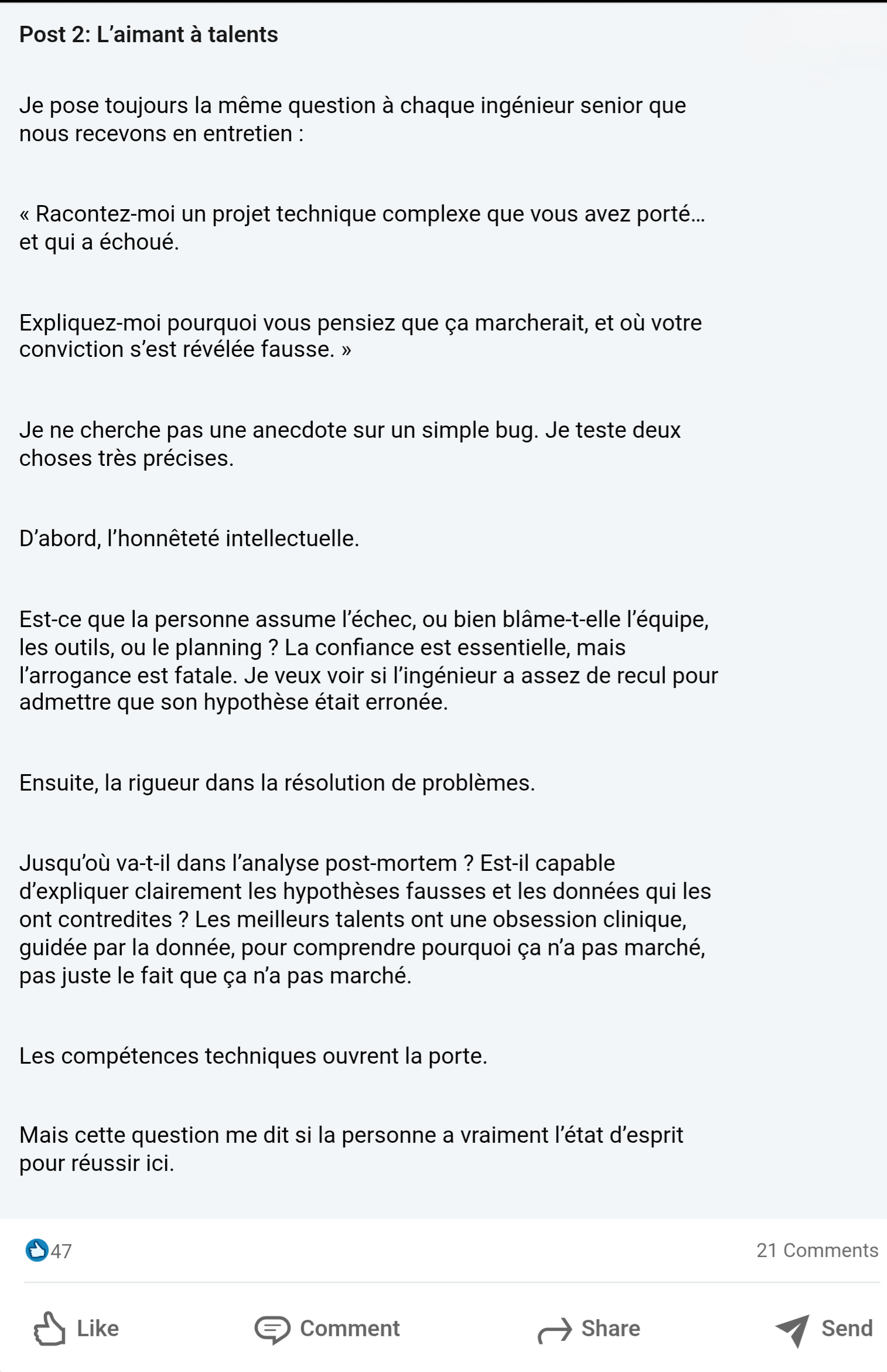 Contenu: « Je pose toujours la même question à chaque ingénieur senior que nous recevons en entretien… »